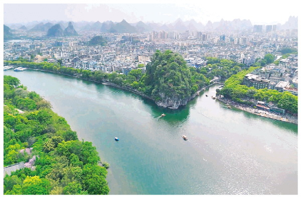 ▲漓江生态警务情报指挥平台启用后,通过智能无人机传回的漓江象鼻山段画面。