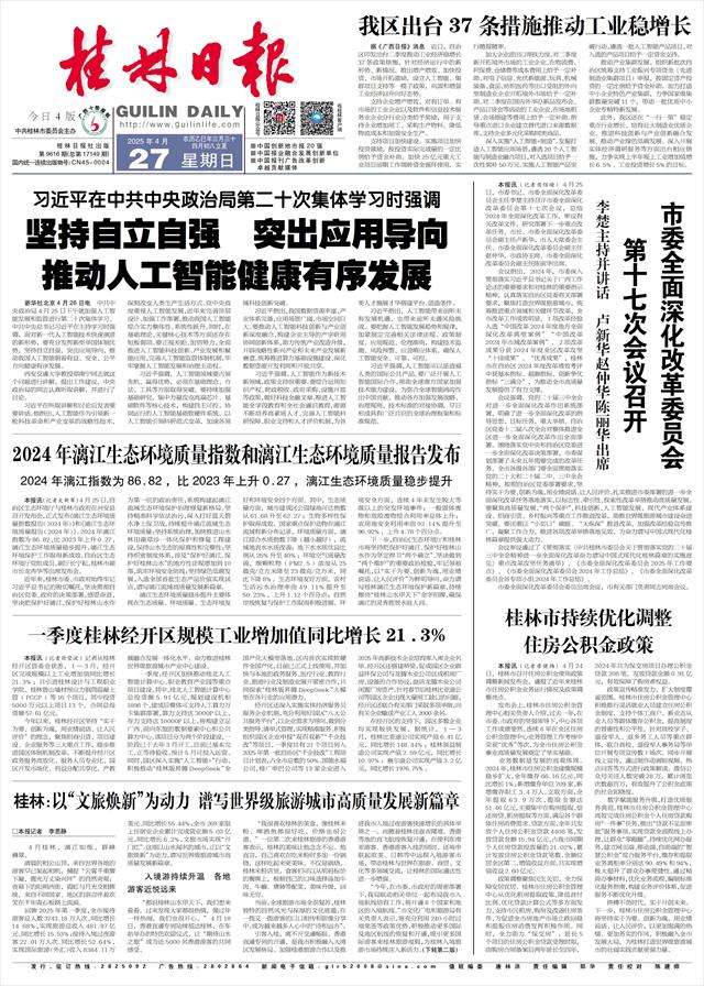 2024年漓江生态环境质量指数和漓江生态环境质量报告发布 2024年漓江指数为86.82,比2023年上升0.27,漓江生态环境质量稳步提升   本报讯(记者文新军)4月25日,自治区生态环境厅与桂林市政府在兴安县召开发布会,正式发布《漓江生态环境质量指数报告(2024年)》和《漓江生态环境质量报告(2024年)》。2024年漓江指数为86.82,比2023年上升0.27,漓江生态环境质量稳步提升,漓江生态环境保护工作取得新成效。自治区生态环境厅党组成员、副厅长宁耘,桂林市副市长龙杏华等出席发布会。