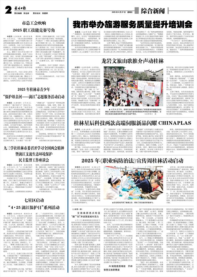 “保护母亲河——漓江”志愿服务活动启动   本报讯(记者陈静)4月25日,在第四个“漓江保护日”到来之际,2025年桂林市青少年“保护母亲河——漓江”环保基金捐赠仪式暨保护漓江青年志愿服务活动在桂林訾洲公园启动。此次活动由市委社工部、市委市直机关工委、市融媒体中心、团市委、桂林银行主办,旨在引导广大青少年以实际行动贯彻落实习近平总书记对广西工作论述的重要要求和对桂林的重要指示精神,全力保护好漓江,保护好桂林山水。桂林旅投集团、桂林医科大学、岩溶所、桂林市少年宫、桂林银行桂林分行等各界青年志愿者代表500余人参加本次活动。