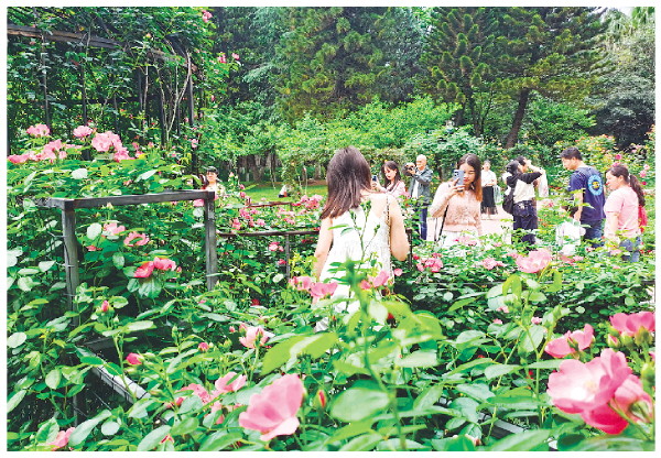 2025年虞山公园精品月季展开展。图为市民在月季花丛中拍照。