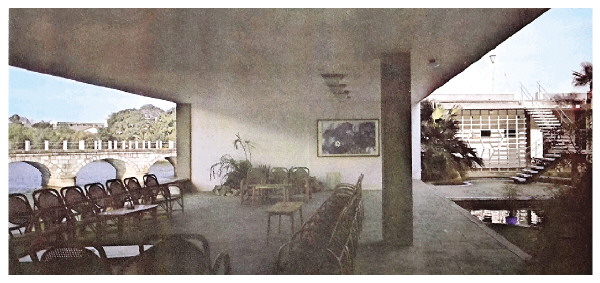 底层设四个开间的敞厅,在炎热的桂林地区,提供了室外休息、冷饮、聚会等室外活动的场所,建筑空间与自然空间融为一个整体,同时也改善了通风条件。自楼梯间向西沿水面有挑廊通达小餐厅,餐厅北临水面,南设小庭院。自厅内面向庭院,可见桂林山水彩色壁画,院内设假山鱼池。