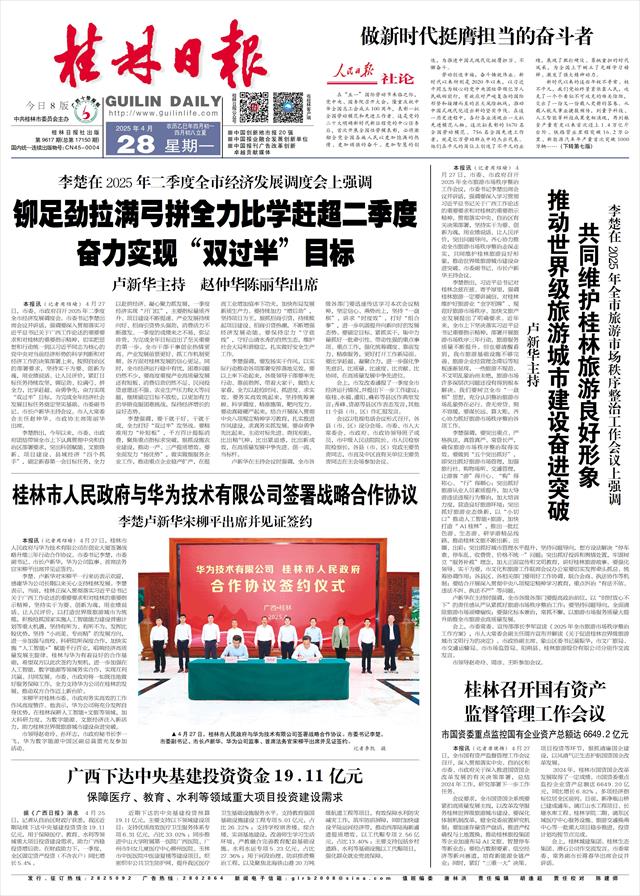 奋力实现“双过半”目标 卢新华主持 赵仲华陈丽华出席   本报讯(记者周绍瑜)4月27日,市委、市政府召开2025年二季度全市经济发展调度会。市委书记李楚出席会议并讲话,强调要深入贯彻落实习近平总书记关于广西工作论述的重要要求和对桂林的重要指示精神,切实把思想和行动统一到以习近平同志为核心的党中央对当前经济形势的科学判断和对经济工作的决策部署上来,按照自治区的部署要求,坚持实干为要、创新为魂,用业绩说话、让人民评价,紧盯目标任务持续攻坚,铆足劲、拉满弓、拼全力,比学赶超、奋勇争先,奋力实现“双过半”目标,为完成全年经济社会发展目标任务奠定坚实基础。市委副书记、市长卢新华主持会议。市人大常委会主任赵仲华、市政协主席陈丽华出席。