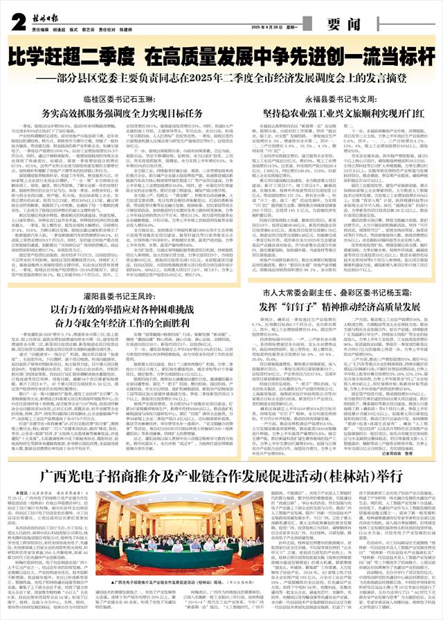 比学赶超二季度 在高质量发展中争先进创一流当标杆 ——部分县区党委主要负责同志在2025年二季度全市经济发展调度会上的发言摘登 临桂区委书记石玉琳: