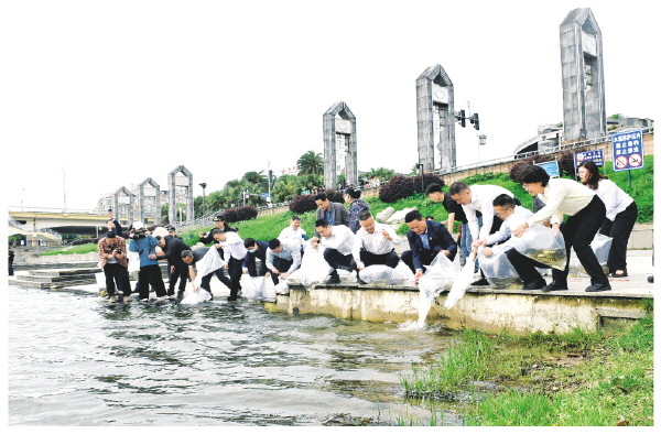 4月25日上午,“4·25漓江保护日”系列活动秀峰分会场——“牢记国之大者 保护好漓江保护好桂林山水”主题活动在逍遥楼下广场举行。秀峰区四家班子领导、相关职能部门负责人及秀峰街道辖区人大代表、政协委员、党员、各族群众代表等200余人参加。活动包括漓江保护知识问答、精美漓江保护面雕与水果雕和非遗剪纸作品展示、增殖放流以及“两个保护”普法小课堂等精彩内容。图为增殖放流活动现场。