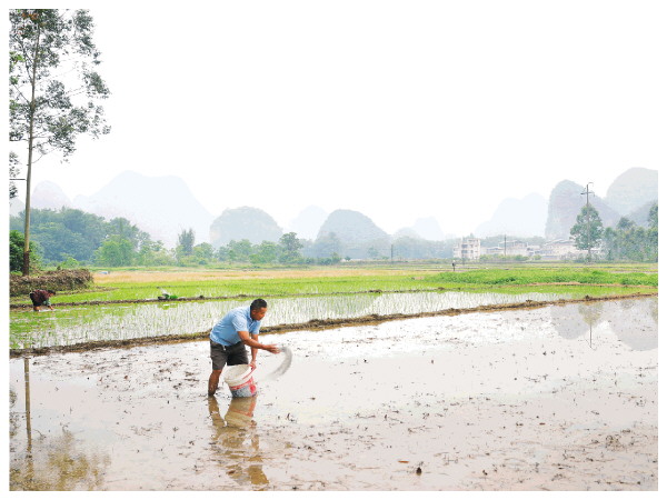 ▲今年一季度,农行桂林分行发放农户贷款余额42.83亿元,比年初增加4.6亿元,助力春耕生产。连日来,桂北地区临桂、阳朔、永福、荔浦、龙胜等地趁降雨多、水量充沛抢抓春插,目前水稻春插面积已过85%,同比增加5%。图为临桂会仙镇同助村村民在田间劳作。伍文悄 摄