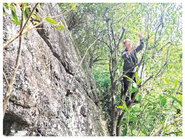 沿着村后两山之间的河道一路驱车颠簸前行,约20分钟后,覃昭雄和欧文轲把车停在了一个海拔约600米的半山腰上。随后,记者跟着他们二人爬山。靠着记忆,在爬山10多分钟后,覃昭雄找到了去年曾到过的一处石崖。在那里,记者看到了一株高约5米的古茶树。