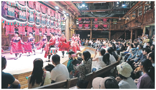 5月1日,在龙胜各族自治县龙脊镇金江村黄洛瑶寨,众多游客在观看民俗表演。“五一”小长假,来自全国各地的游客在龙脊梯田和各民族村寨游览。
