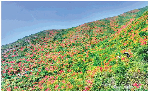 荷包山坐落于漠川河西岸、五里峡水库之滨,海拔726米,“野火樵斤都不到,层层开上杜鹃花”。顾景星的《白云山访龚百子》中描绘了杜鹃花生长在人迹罕至的地方,有一种远离尘嚣的宁静和自然之美,而时下这便是荷包山的样子。