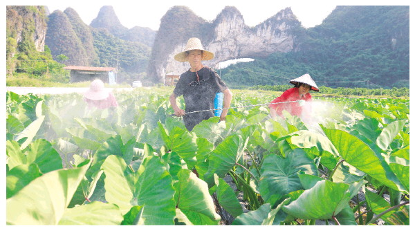 青龙乡位于平乐县南部,山清水秀、空气清新,自然环境得天独厚,是自治区级生态乡镇。青龙香芋作为青龙乡的传统特色农产品,早就声名远扬。近日,记者来到青龙乡,村道两旁,到处都是青青芋田。不少农户正在田间忙碌。