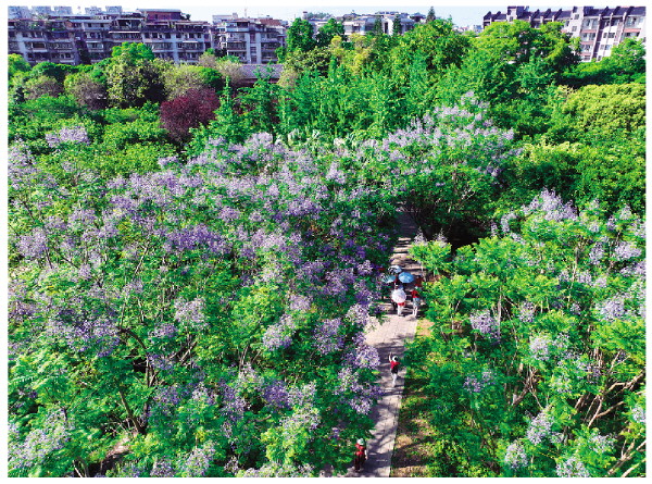 5月11日,记者在南溪山公园看到,步道两侧种植的蓝花楹尽情舒展身姿,一朵朵蓝色花朵似灵动的精灵簇拥在一起,构成一幅绝美的画卷,美得令人心醉。站在树下抬头望去,苍劲有力的枝干向天空伸展,阳光穿过层层叠叠的花叶缝隙洒下点点金光。在阳光的映衬下,蓝色花朵与翠绿树叶被镀上一层柔和光晕,更显清丽绝伦。盛开的蓝花楹吸引了众多市民、游客前来观赏拍照,邂逅大自然的浪漫与诗意。