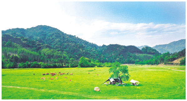 ◥近日,在灵川兰田瑶族乡的“一棵树”草坪上,游客搭建的帐篷、成群的黄牛、绿意盎然的草地,与跌宕起伏的山峰相映成趣,形成一幅美不胜收的画卷。近年来,“乡村游”成为很多市民的选择,每逢周末、节假日,不少市民选择走出家门来到乡村,亲近自然,体验民俗风情和田园牧歌式的生活,助力了乡村旅游。