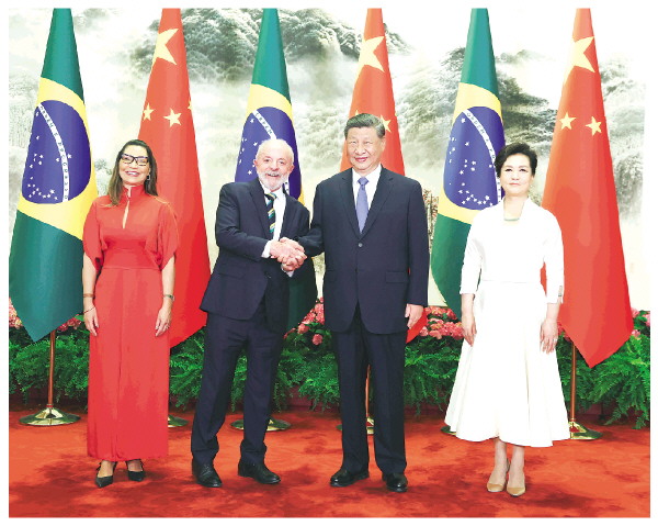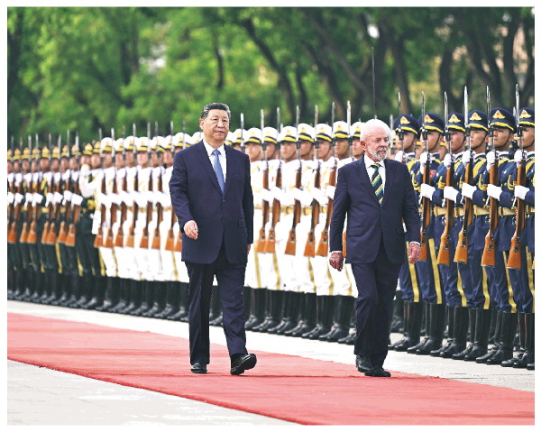 5月13日下午,国家主席习近平在北京人民大会堂同来华进行国事访问的巴西总统卢拉举行会谈。这是会谈前,习近平在人民大会堂东门外广场为卢拉举行欢迎仪式。 新华社记者燕雁 摄
