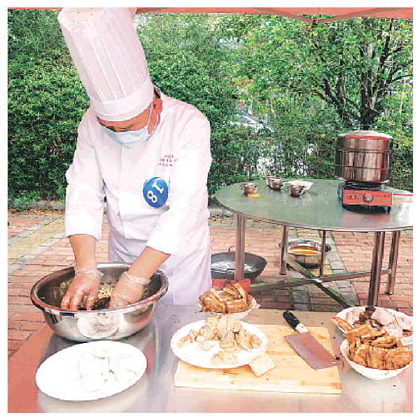 同安扣肉技能竞赛现场,参赛选手正在制作扣肉。