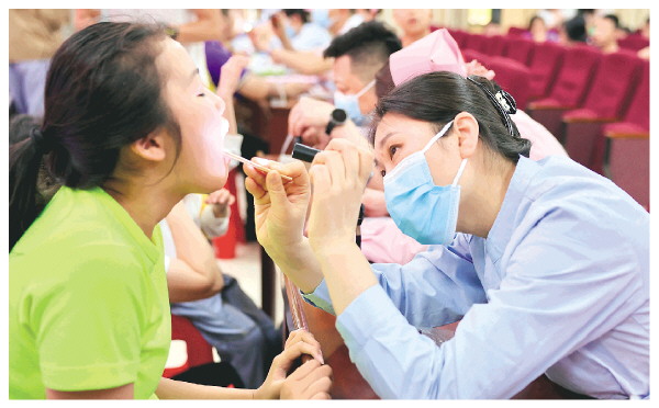 活动现场,医生们为聋哑儿童检查牙齿,普及口腔健康知识,并向桂林市聋哑学校捐赠了一批口腔保健用品,帮助他们健康成长。 记者李凯 摄