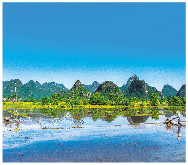 图为近日,塘北村农民在“天空之镜”里耕田。记者何平江 摄