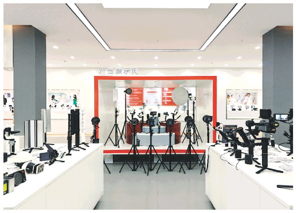▲在桂林智神的产品展示大厅里,各类造型新颖、科技感十足的云台稳定器、影视灯具等产品整齐陈列。