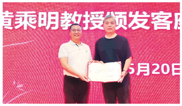 张鹏程校长为黄乘明教授颁发校外教师聘书。万璐 摄