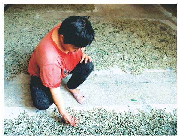 ▲广福乡广福村蚕农在查看第二批蚕宝宝的长势。 记者李忠波 摄