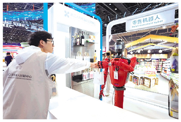 ▲5月22日,浙江人形机器人创新中心工作人员在“数智中东欧”展区展示一款零售机器人。