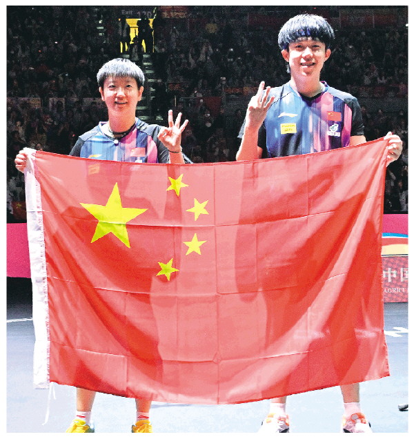 ◥5月24日,王楚钦(右)/孙颖莎在夺冠后庆祝。