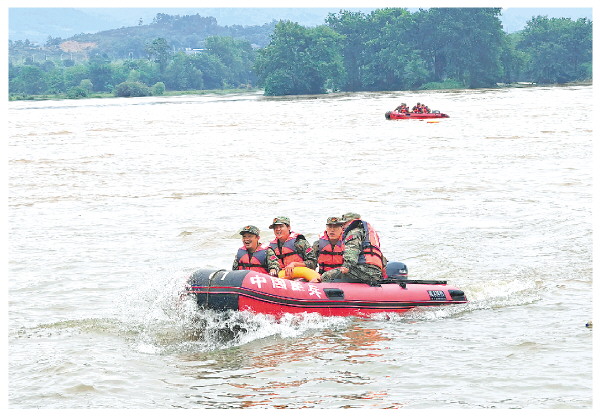 5月24日,全州县民兵驾驶冲锋舟进行水上救援演练。当天,全州县组织100多名民兵在湘江三江口河段举行防汛抗洪救援应急综合演练,进一步提高当地民兵队伍防汛应急处置和水上抢险救援能力。 邓琳 摄