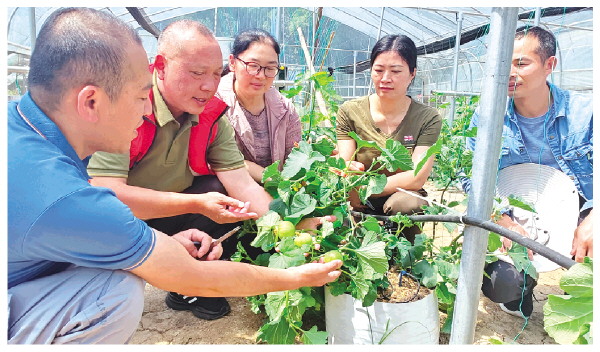 全州县农技专家和种植户一起,察看采用“智袋丰香”技术种植的香瓜的长势情况。邓琳 摄