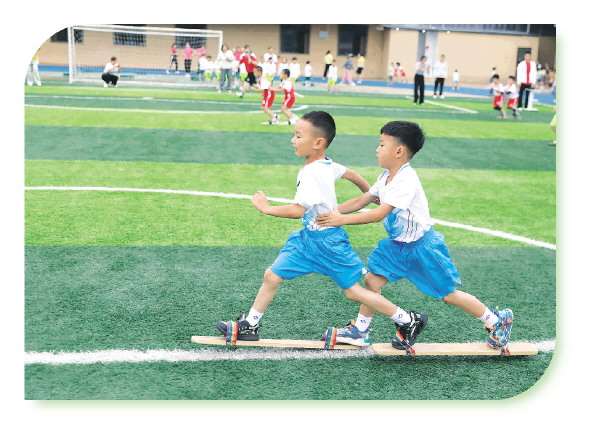 运动会现场,孩子们的欢笑声、加油声此起彼伏。双人板鞋竞速赛区,一对对小伙伴手攀着肩,喊着“一二、一二”的口号,努力保持步调一致向前迈进。有的孩子配合默契,一路小跑冲向终点;有的则摇摇晃晃,差点摔跤,但依然笑嘻嘻地爬起来继续比赛,引得场边的家长和老师忍俊不禁。