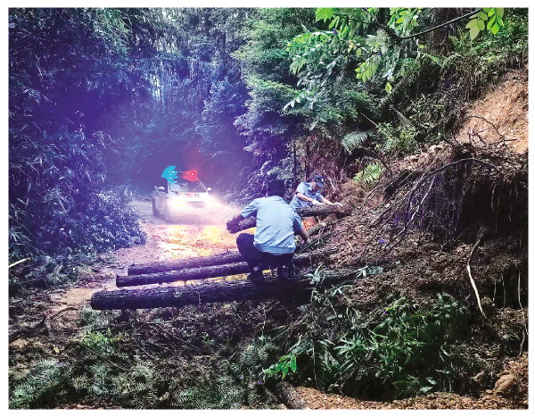 ▲平乐县桥亭乡六冲村委桂冲水库附近因下雨导致路边土坡塌方,树木倒下挡住道路。桥亭派出所值班人员紧急清理路障保障通行。