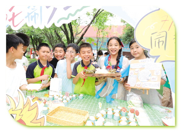 ▲育才小学的非遗美食摊位前,孩子们展示精心准备的美食。