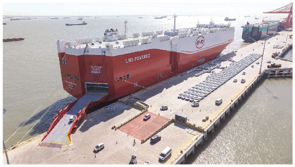 出口汽车在苏州港太仓港区码头集中装载上“深圳号”汽车运输船(2025年4月26日摄,无人机照片)。