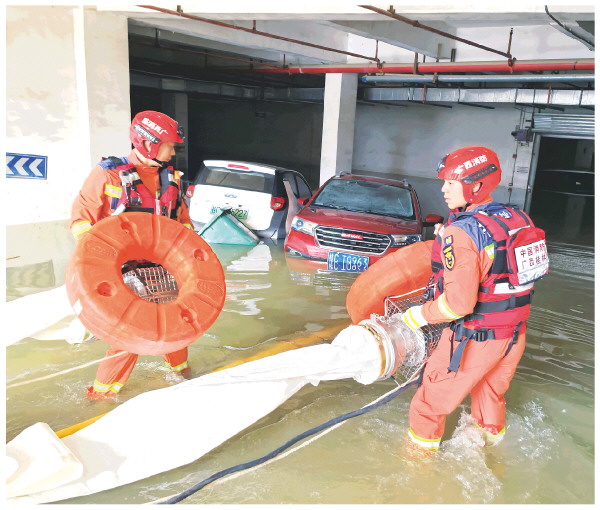 消防救援人员在地下车库排涝。 黄结 陆婷婷 摄
