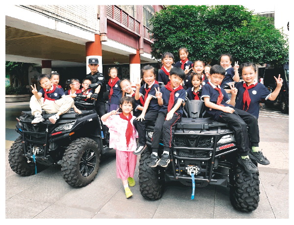▲榕湖小学学生与特警装备合影。(学校供图)