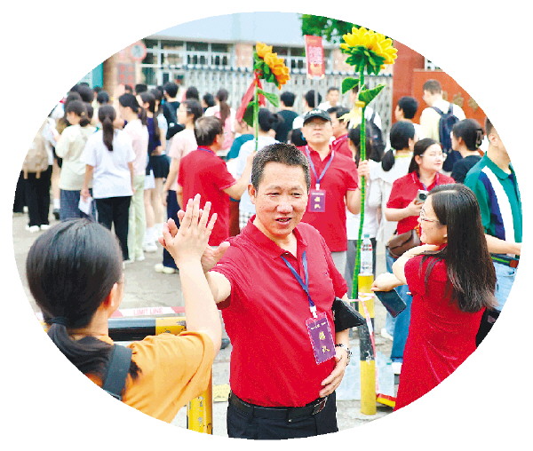 ◥6月7日,在市区田家炳中学考点,送考老师带着象征“一举夺魁”的大葵花,为考生加油鼓劲。