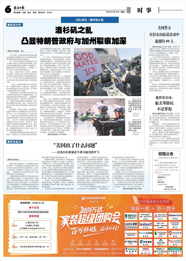 据报道,这是60年来美国总统首次在未获州长请求情况下直接调动该州国民警卫队应对国内骚乱。加州及洛杉矶地方政府强烈反对联邦政府这一举措,加州政府与联邦政府、共和党与民主党的移民政策冲突更加激化。一名现场民众在和记者交谈时问道:“这是你印象里的洛杉矶吗?现在美国出了什么问题,总是一半人在反对另外一半人。” (新华社洛杉矶6月8日电)