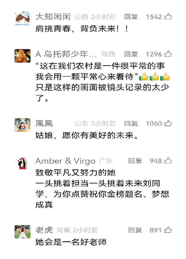 一名内蒙古网友“光阴的故事”说:高考结束女孩火了,火的不是她考得是否好,火的是她肩上的担子挑得有多稳,火的是她目光的坚定和从容,火的是她脚下淡定的步伐,火的是她能在现今的社会挑得起担子,也必能挑得起未来……长长的路自己走。
