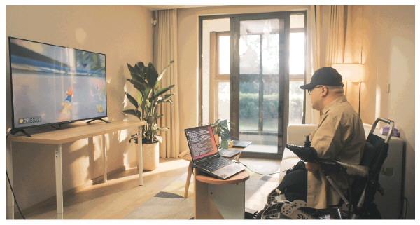▼4月30日,在位于上海的受试者住所,受试者通过脑机接口玩赛车游戏。