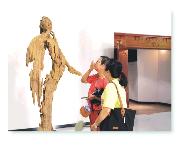 市民站在这些颇具个人特色的木根雕作品前仔细观摩,赞不绝口。
