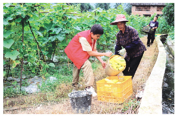 连日来,兰田瑶族乡政府组织志愿者帮助当地农户采收、搬运黄瓜。 黄鑫 摄