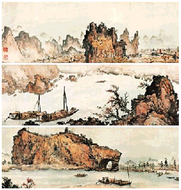 “我作画,都是有感而发,深入生活也注重感受。我觉得,即使是同一座山、同一条水,时代不同,大小环境不同,心境不同,登临时的感受也是不同的。抗日战争年代的1941年,我第一次到山水甲天下的桂林时,曾花了几个月时间画过一幅手卷叫作《漓江百里图》。直到半个世纪后的1991年春重游桂林时,山河变化虽然不很大,但在感情上却与抗战年代的心境大不相同,时代气息也大不一样,因有实感而重画了一幅长卷叫作《漓江百里春》。”