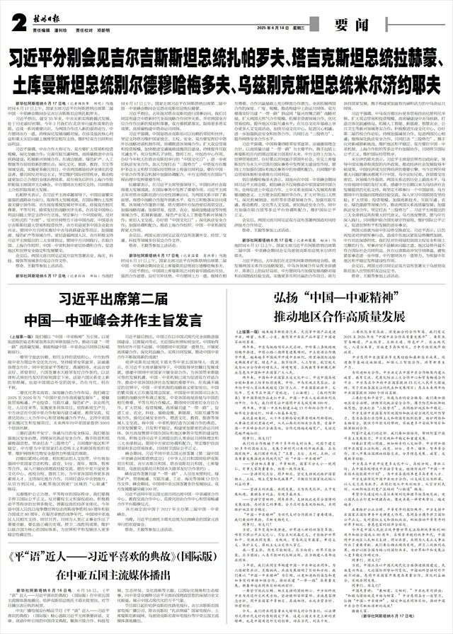 两年来,中国同中亚国家共建“一带一路”走深走实,贸易额增长35%,产业投资、绿色矿产、科技创新等合作积极推进。中方提供的一揽子金融支持项目正在全面落实。(下转第二版)