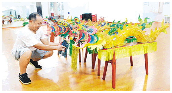 图④:谢文华正在悉心打理赤、橙、黄、绿、蓝五条板凳龙。记者蒋璇 摄