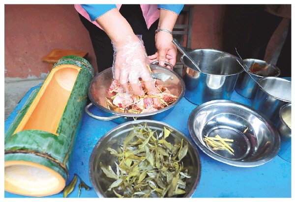 ▲对茶香竹筒鸡进行拌料。