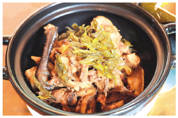 据谢福复介绍,制作茶膳的第一步,是采摘鲜嫩的古树茶叶,经机器蒸熟、晾干后备用,这是成就茶香佳肴的关键基础。目前,茶香鸡、茶香清蒸鱼、茶香竹筒鸡是茶膳馆的主打菜品。