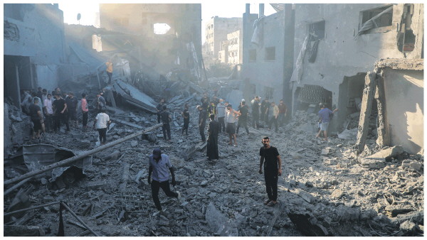 6月27日,民众在加沙城查看以军袭击后的废墟。