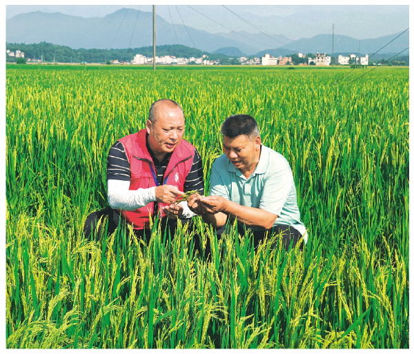 ▲蒋启斌在全州县龙水镇禾美稻香现代农业核心示范区与种粮户一起查看水稻灌浆情况。 邓琳 摄