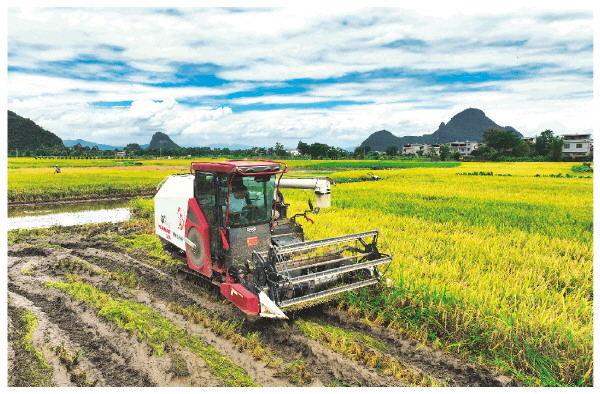 本报讯(记者李忠波 通讯员莫培矩 吴斯辉)时下,临桂区会仙镇的田野里,金黄的早稻与青绿的中稻交织成绚丽的色块。成熟的早稻垂下饱满稻穗,身披金装,在微风中翻涌成金色绸缎,丰收的喜悦在田间流淌。随着收割机轰鸣启动,会仙镇早稻收割大幕拉开,机械穿梭、人影忙碌,奏响夏日丰收乐章。