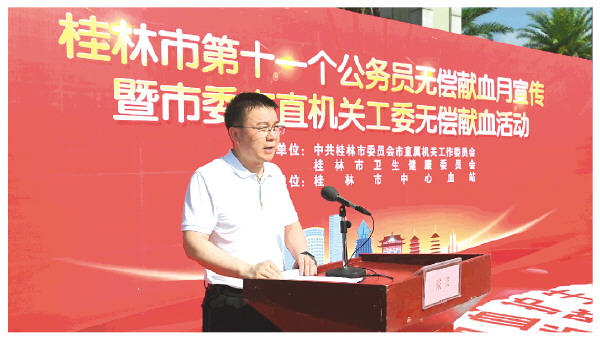 市政府副秘书长夏春艳,市委市直机关工委分管日常工作副书记叶琴,市卫生健康委党组书记、主任戴波出席活动。市各机关单位、市直属机关工委直属各党组织、大中专院校、城区卫生健康局和市直及驻桂医疗机构的党员和干部职工以及桂林市荣获全国无偿献血奉献奖的献血者代表参与其中。