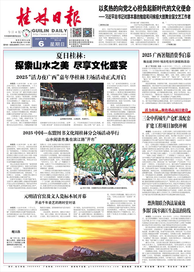 本报讯(记者李思静 文/摄)漓江河畔好读书。7月4日,由自治区党委宣传部指导,桂林市委宣传部、桂林市文化广电和旅游局、广西师范大学出版社集团、漓江出版社有限公司、桂林市新华书店有限公司联合主办的2025中国—东盟图书文化周桂林分会场暨山水阅读市集,在滨江路向市民游客开放,带来山水与文化交织相融的阅读体验。