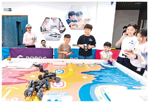 孩子们操作手柄控制机器小车进行对战。 章艳 摄
