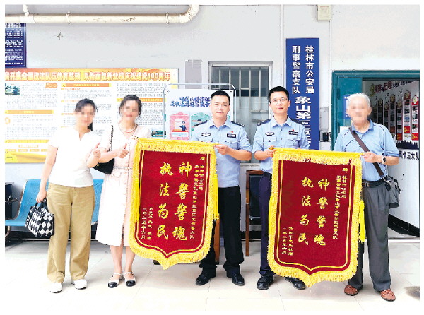 ◤干大爷和家人送上两面锦旗,再三对办案民警表示感谢。